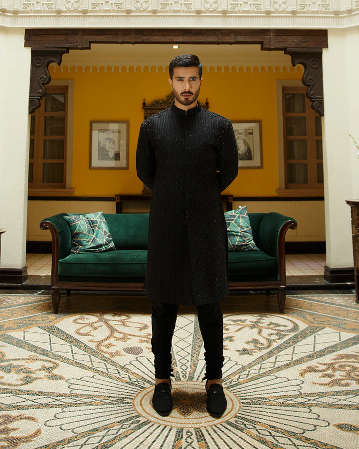 Description: Burak – Make a sartorial statement in this fully embroidered and hand embellished knee length sherwani that’s carefully constructed to accentuate the shoulders and create a flattering shape. Featuring the right amount of glimmer, Burak comes with churidaar and an undershirt to switch on your styling game.